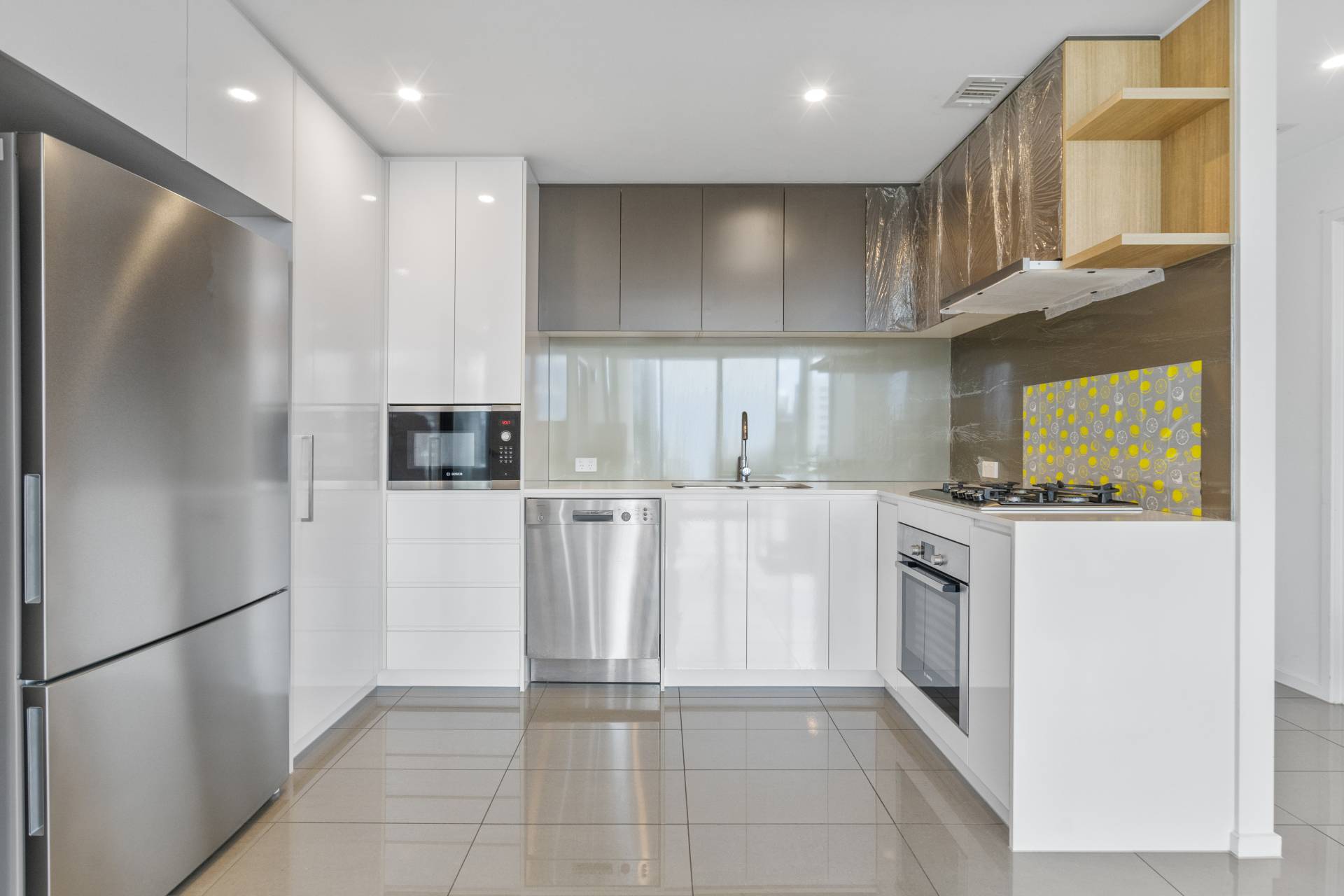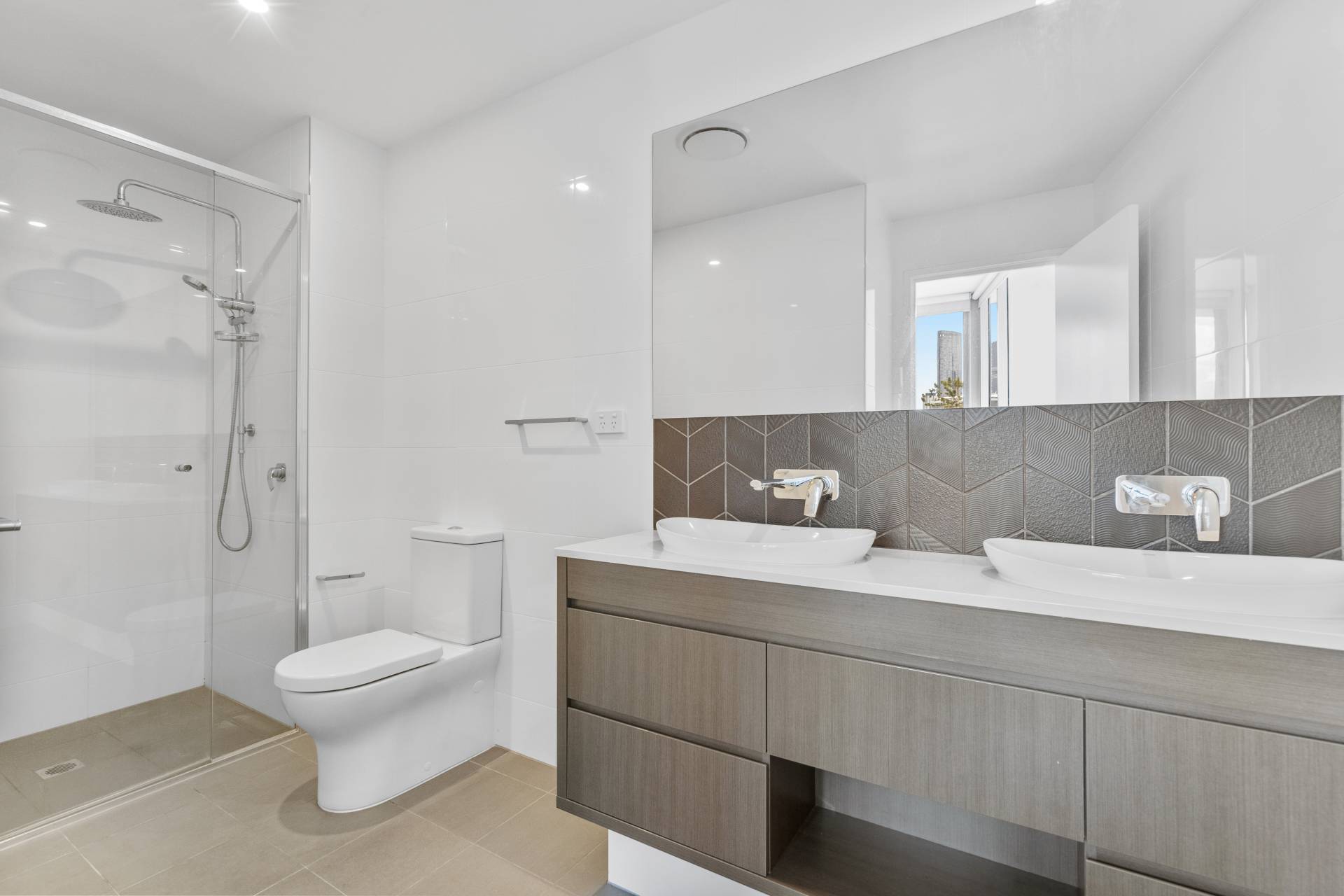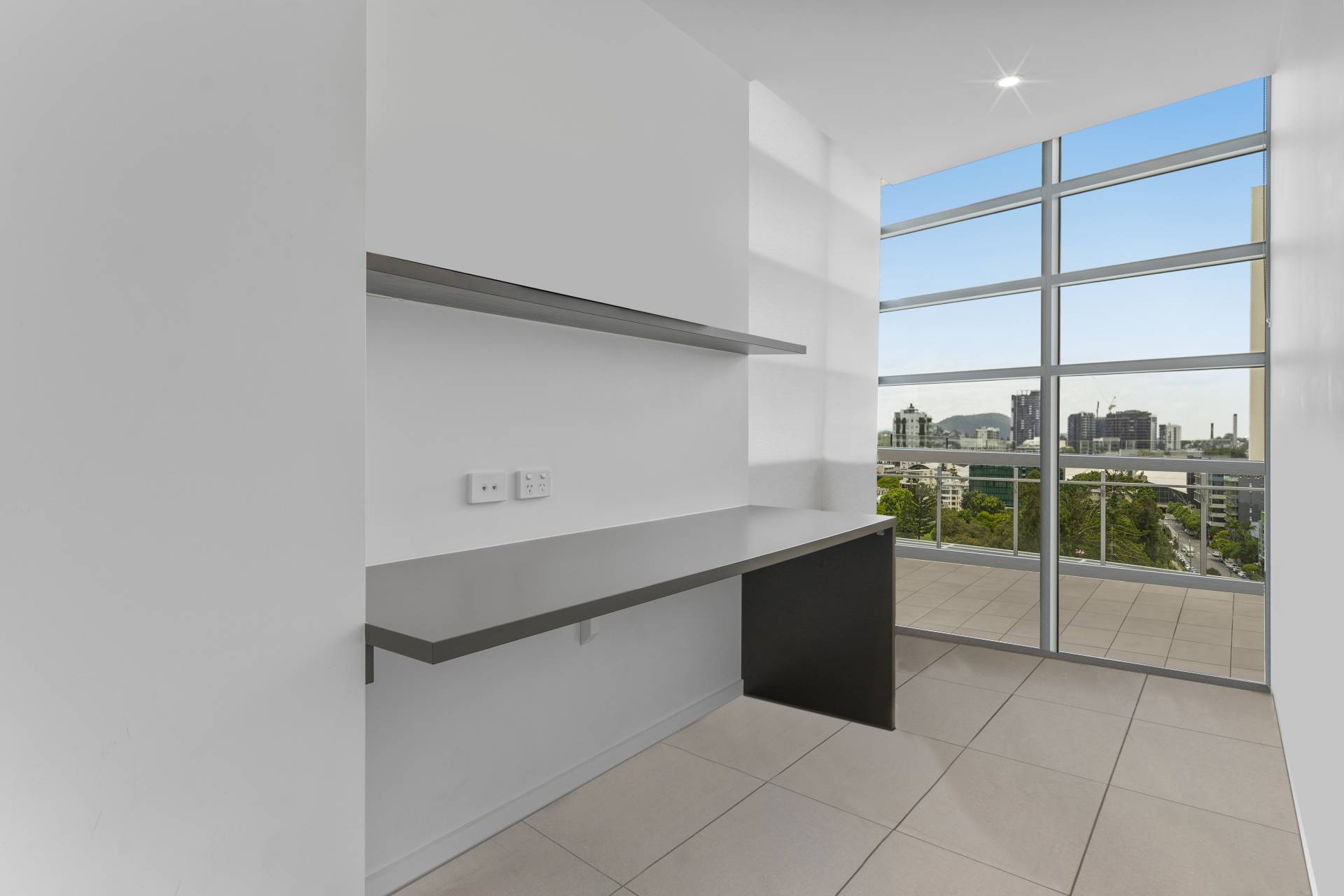 Step inside this modern sanctuary, where low-maintenance tiled flooring and soaring 2.7m ceilings create an inviting atmosphere enhanced by ducted air conditioning for year-round comfort. The thoughtfully designed open-plan living and kitchen area flows seamlessly to a spacious balcony with city skylights, ideal for relaxation and entertaining guests. The layout includes two generously sized bedrooms, thoughtfully separated for added privacy. The master suite features a walk-in robe and a luxurious ensuite, while the second bedroom, conveniently located near the second bathroom, includes a built-in wardrobe. Additionally, a spacious study or home office provides the perfect setting for working from home. You can enjoy captivating city views from multiple vantage points throughout the apartment, adding an extra touch of charm to this exceptional living space.