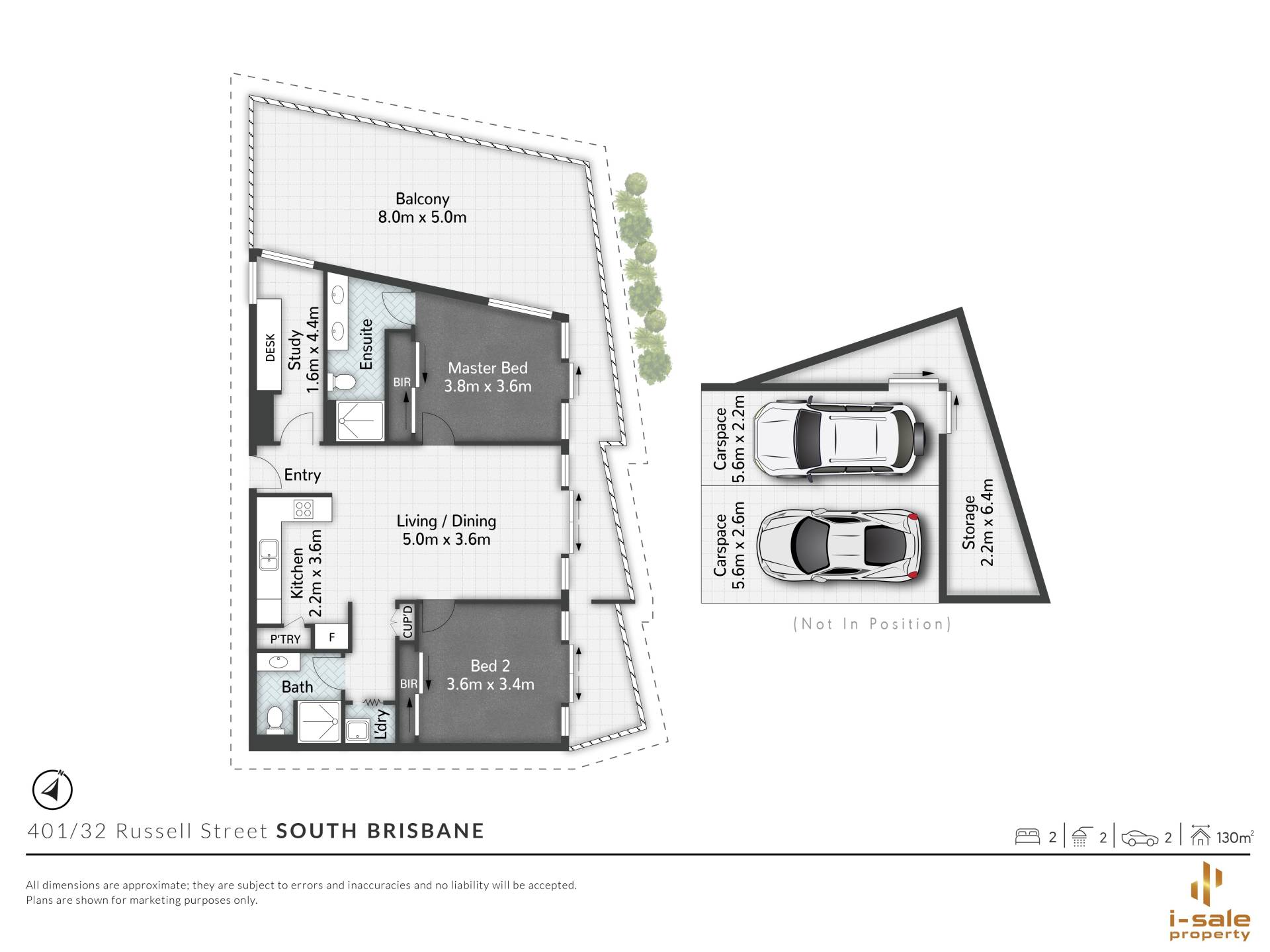 - 2 bedrooms plus study/home office, 2 bathrooms