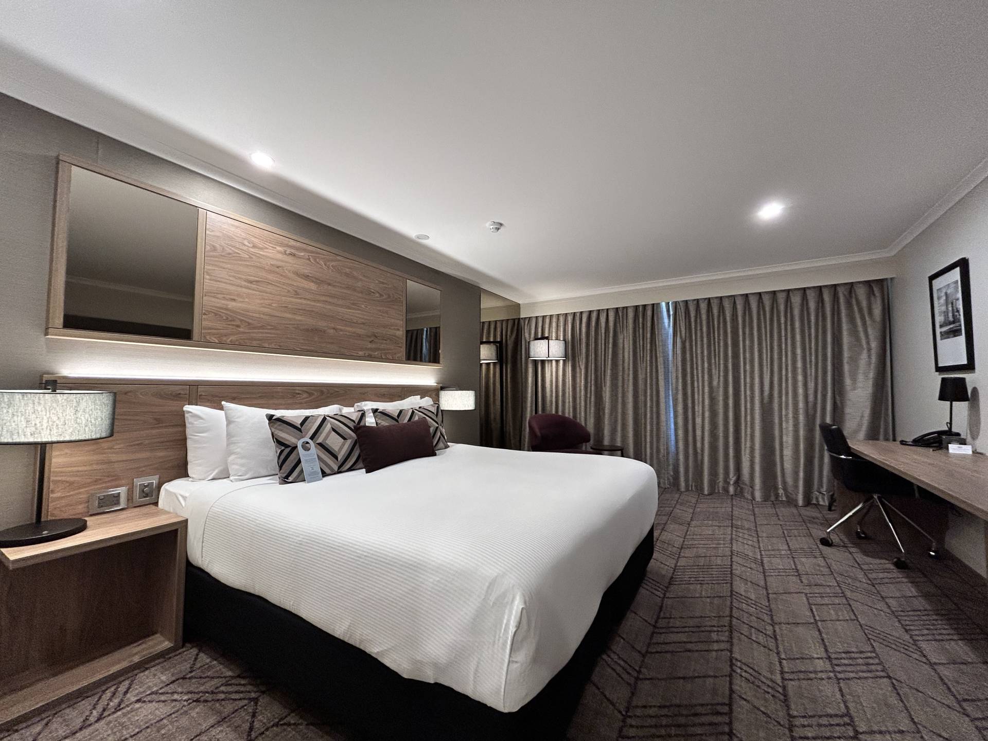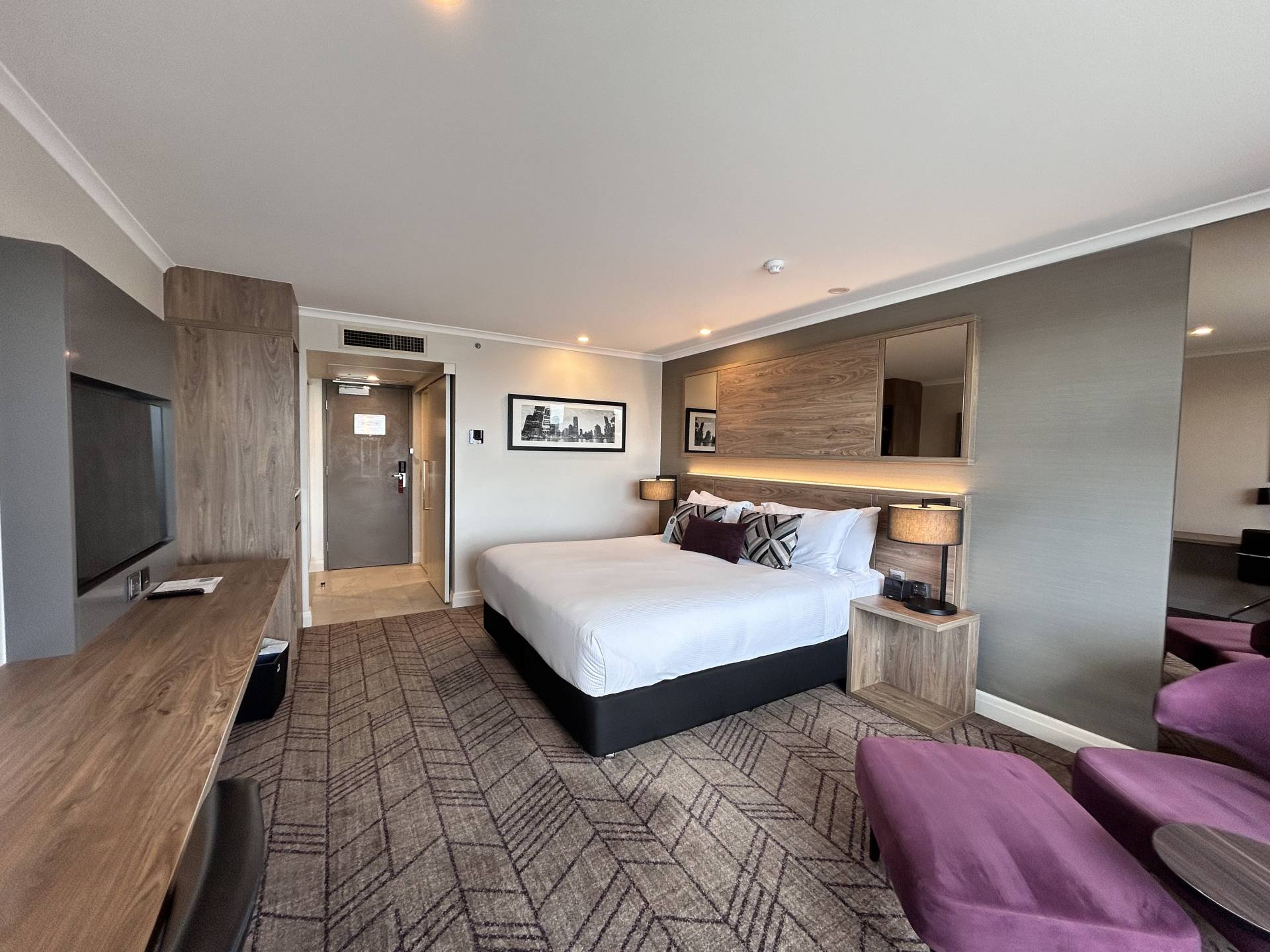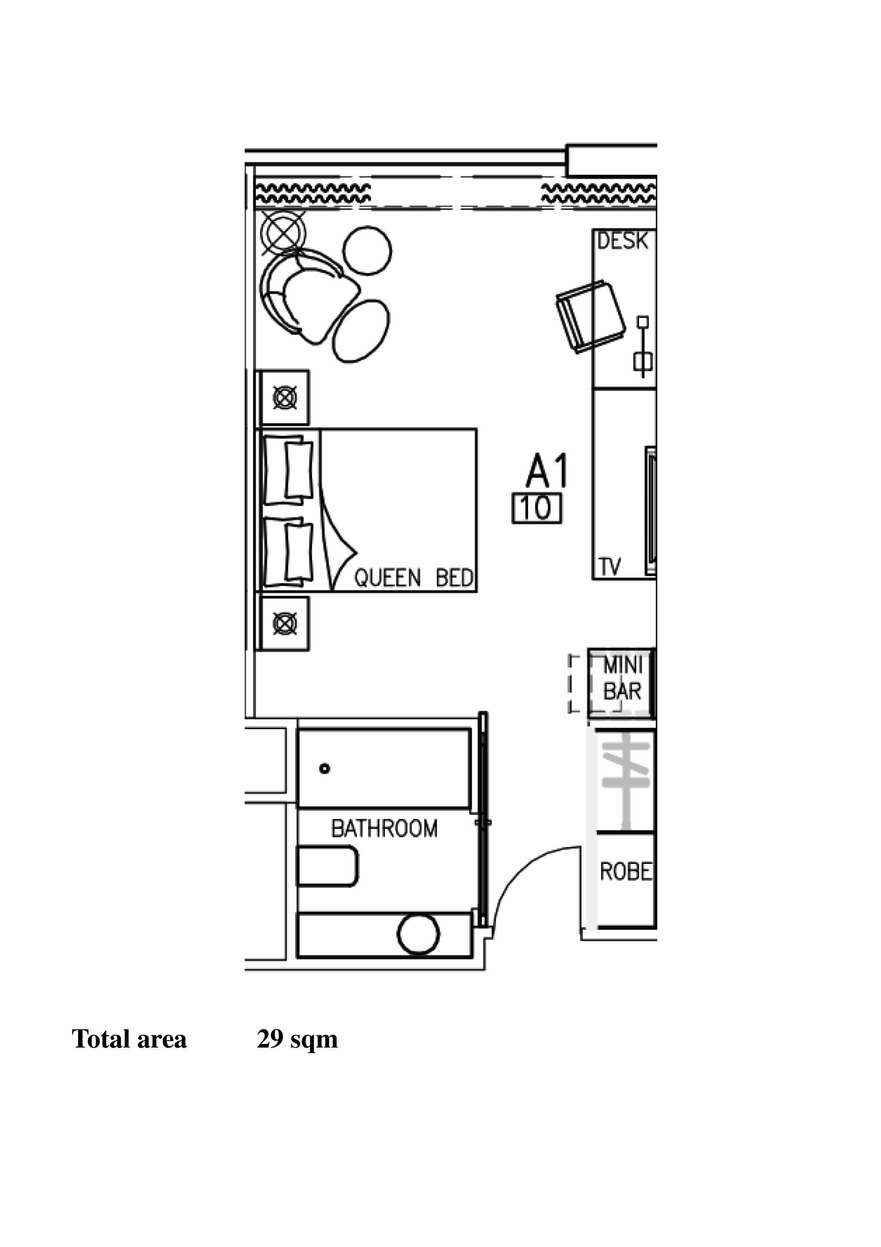 • Luxurious studio room with Queen bed, reading chair, TV, mini fridge and tea and coffee making facilities.
