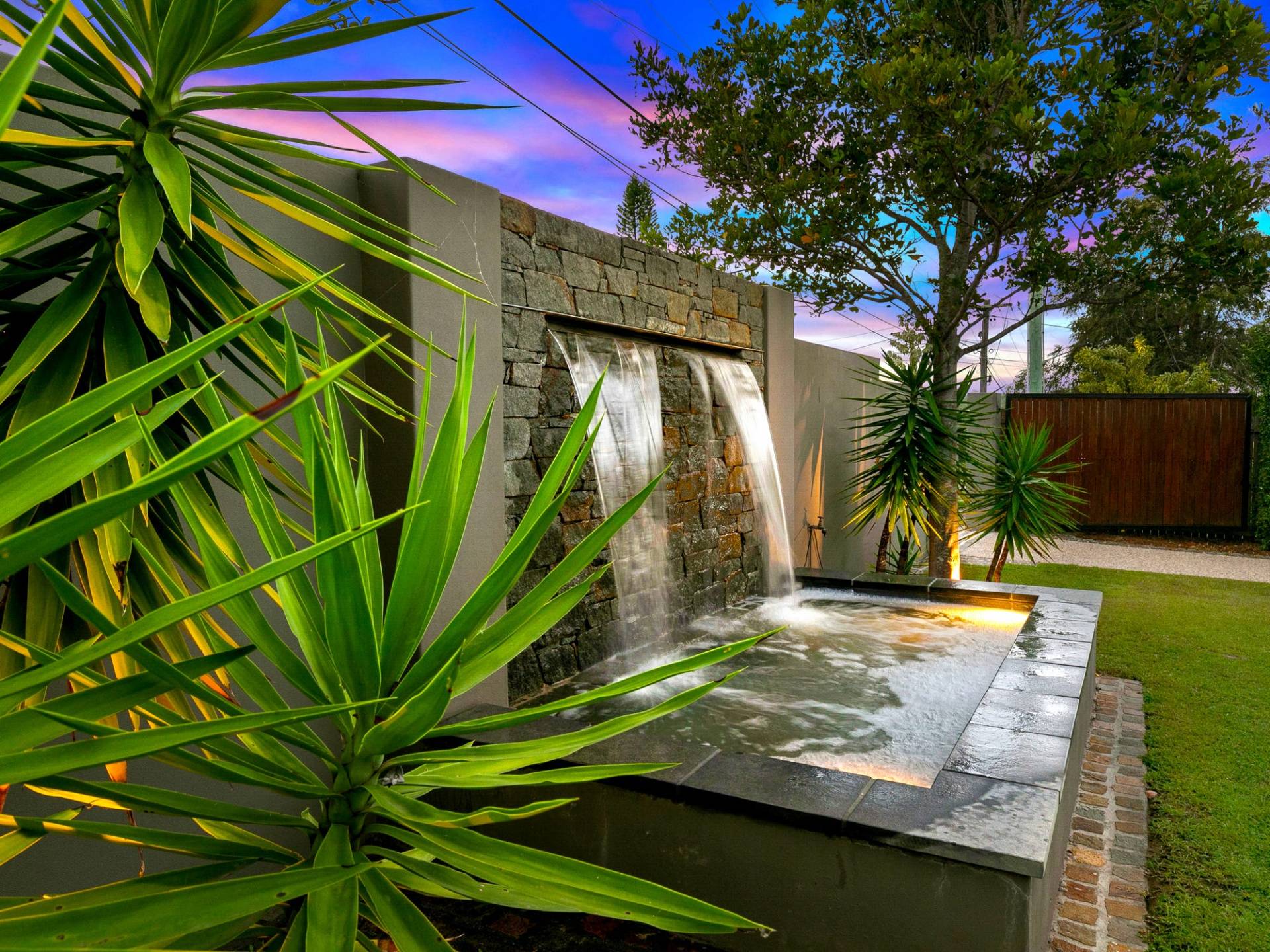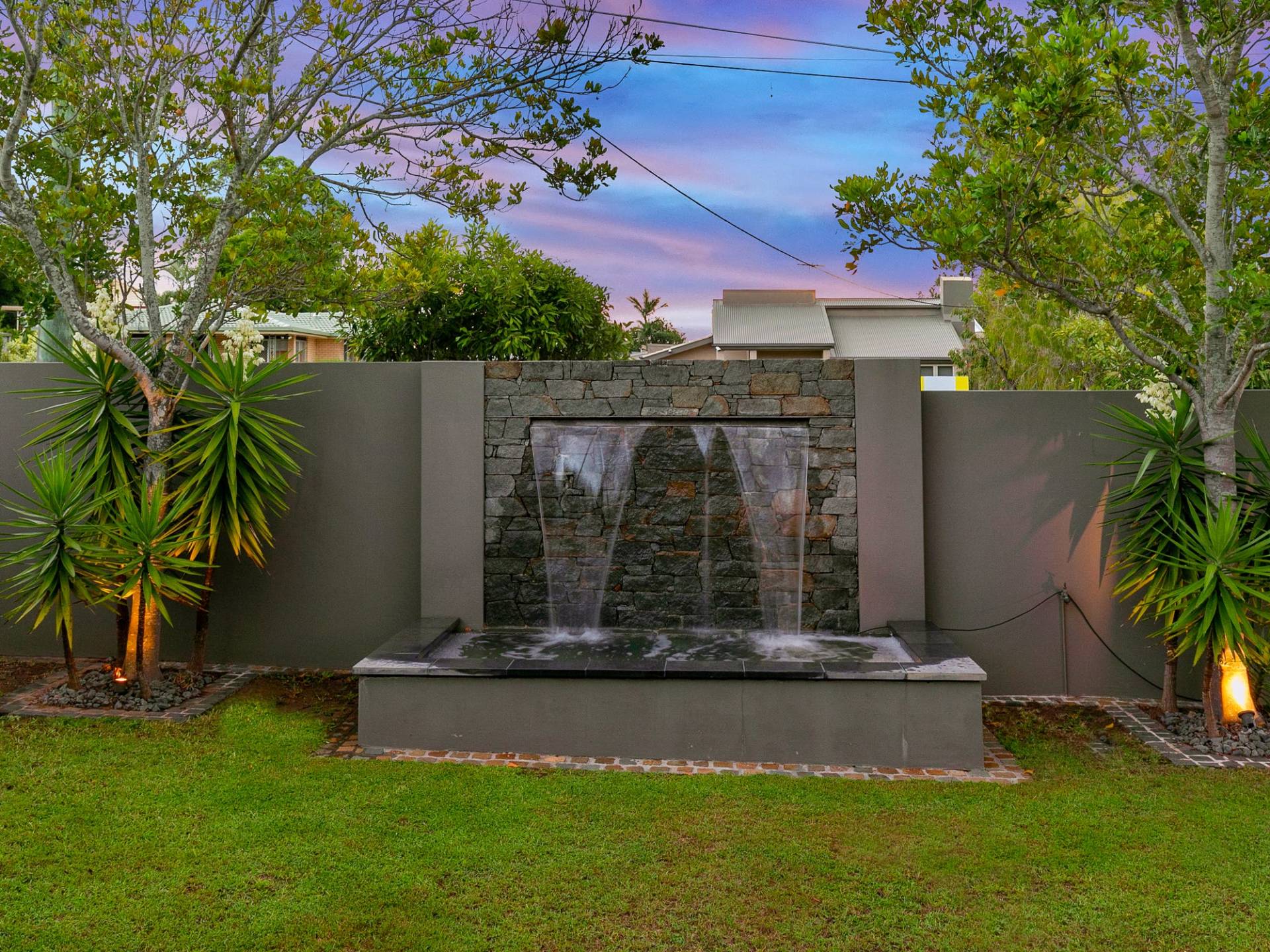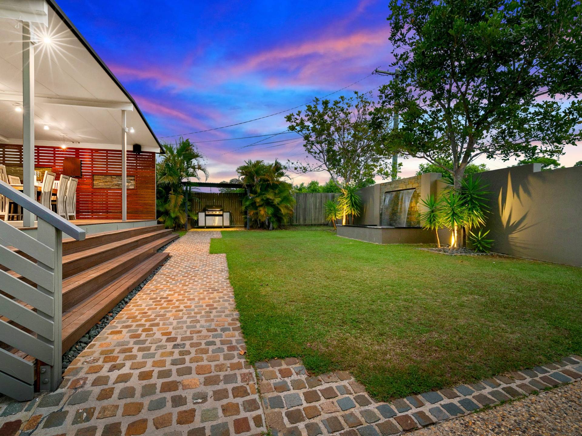 - Front yard w/ water feature and covered BBQ area