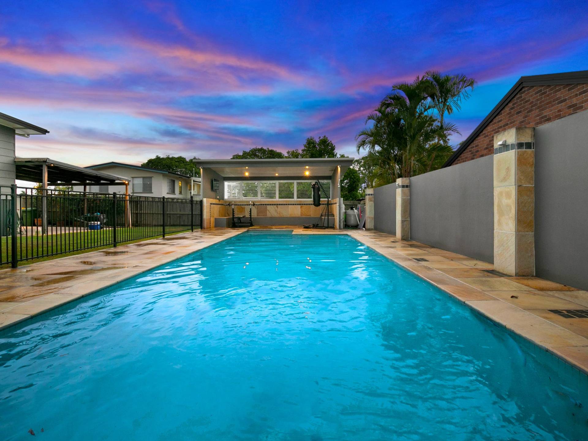 - Pool w/ open air pool house featuring plantation shutters for maximum airflow