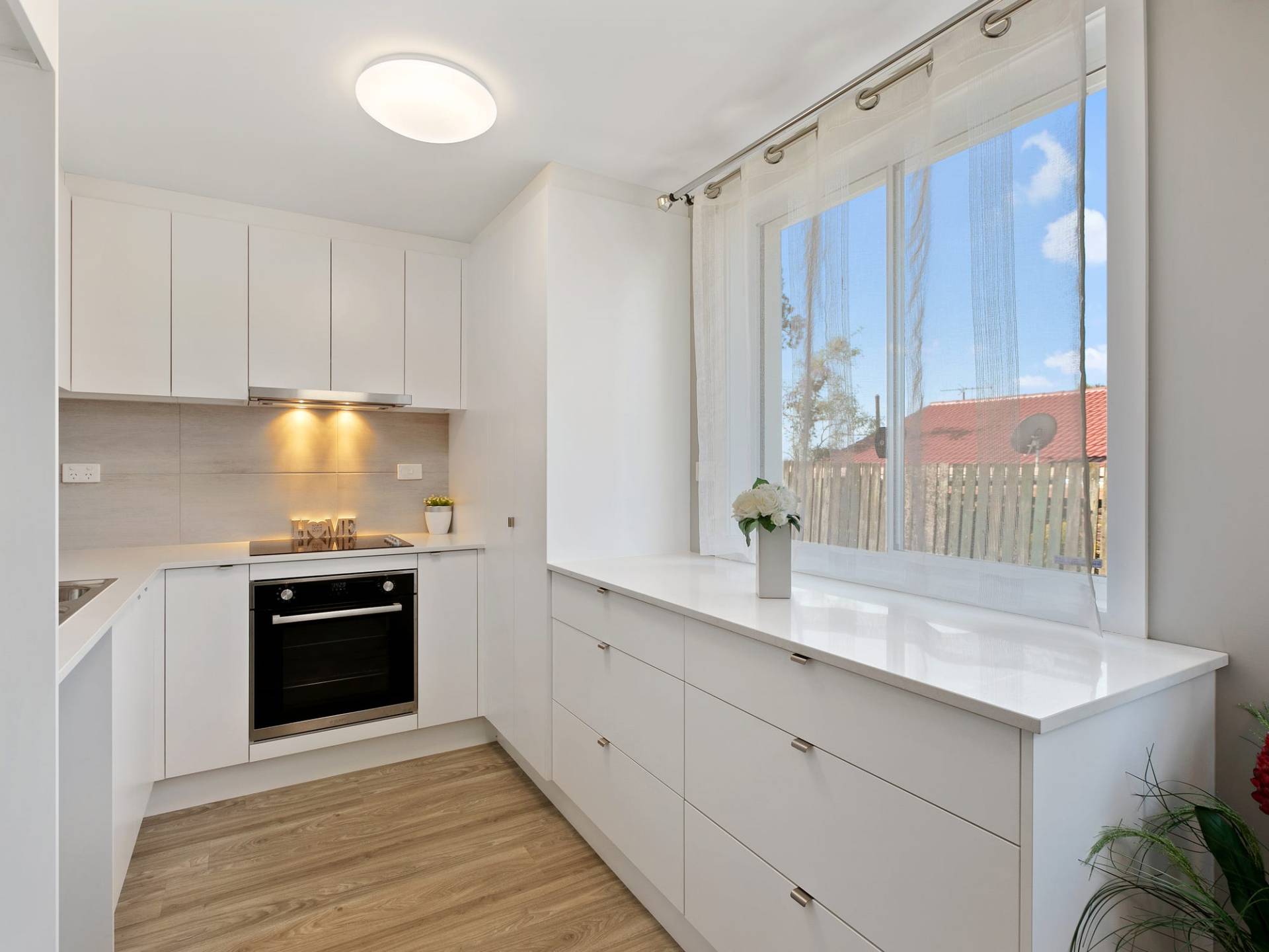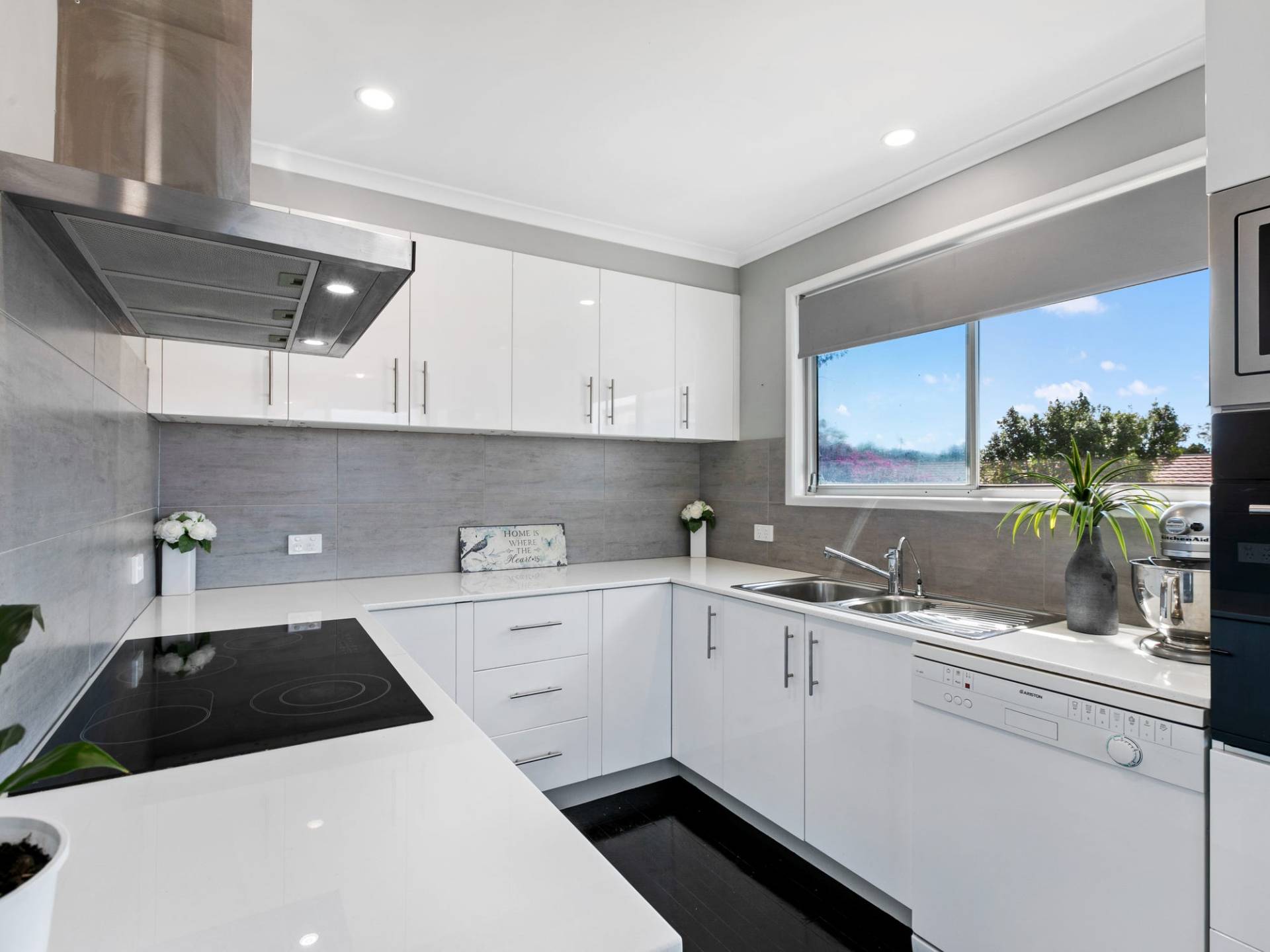 - Kitchen w/ dual sink, electric cooktop, range hood, bench height oven, microwave, dishwasher and marble bench tops
