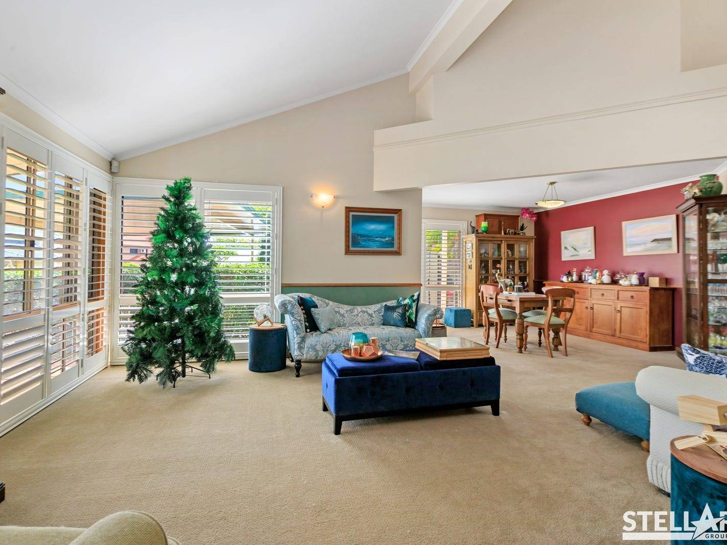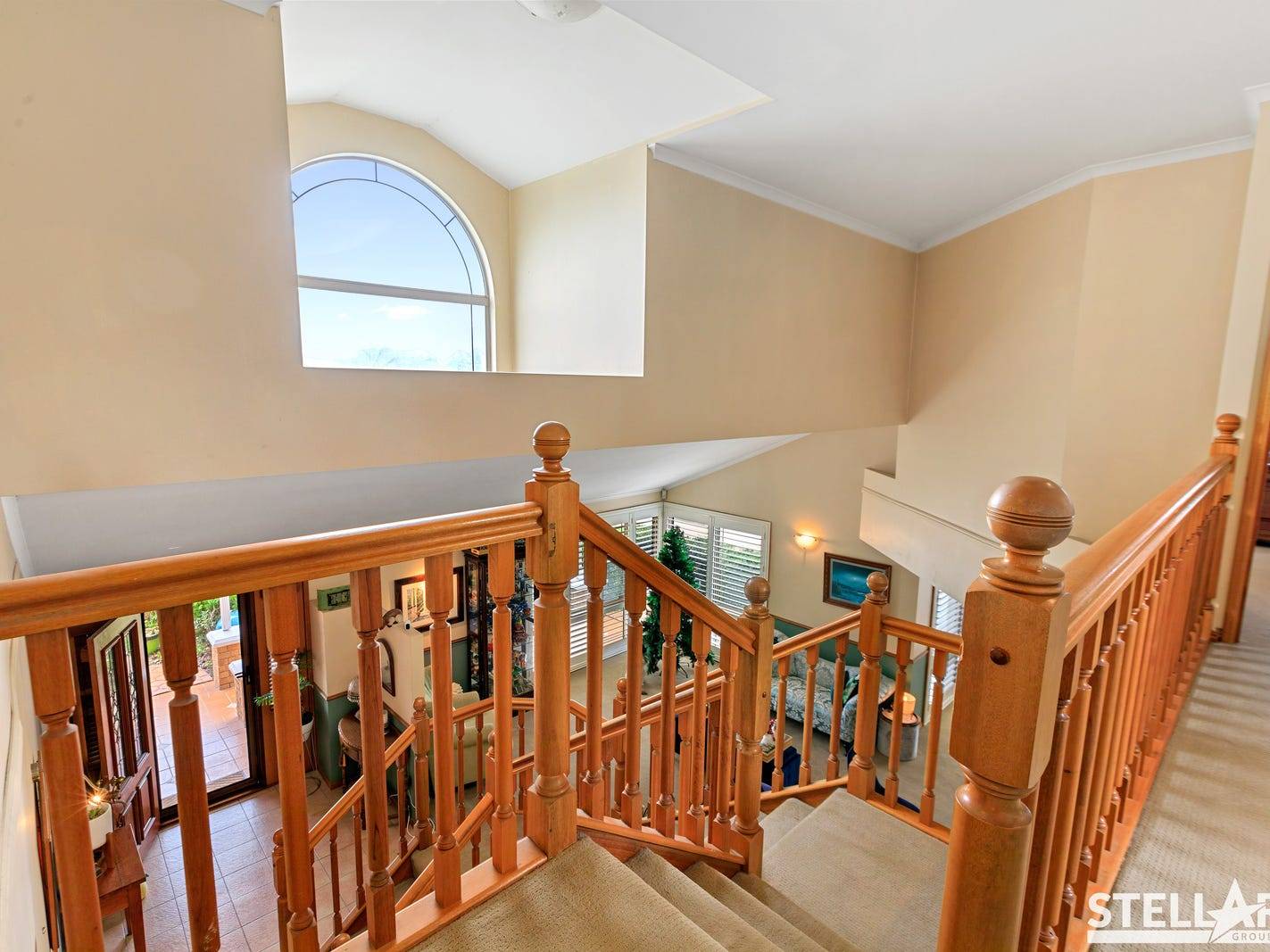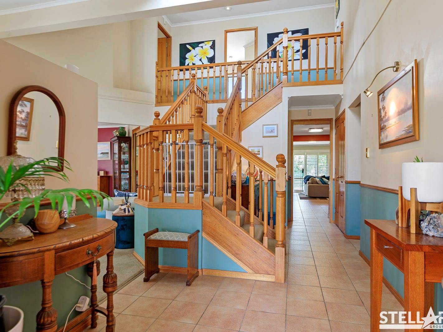 Welcoming you into 43 St Clair Crescent Wishart are timber doors with stained glass panels. There's an entry foyer with high ceilings, another striking feature is the staircase with timber rails. Off to the left are the formal lounge and dining with plantation shutters on all windows. The dining has easy access to the well appointed kitchen including long wrap around stone benches, double fridge/freezer space, electric stove and separate oven, large family pantry, soft close cabinetry, dishwasher, double sink with garbage disposable plus a reverse osmosis water filter system.