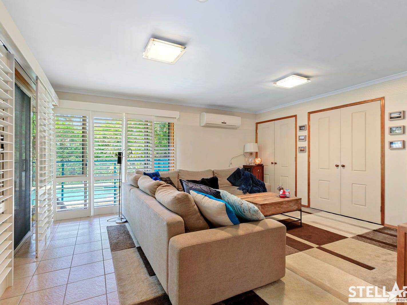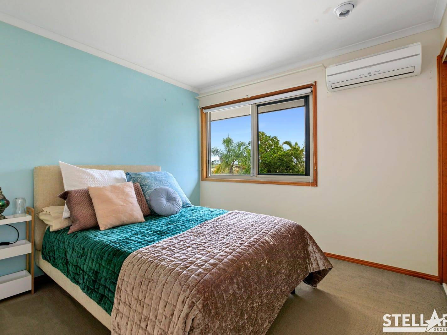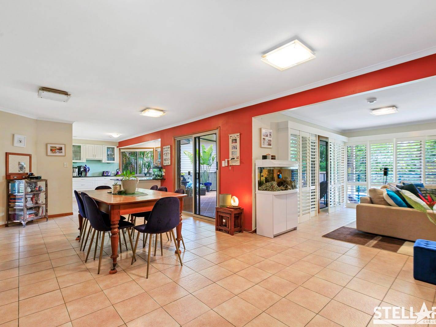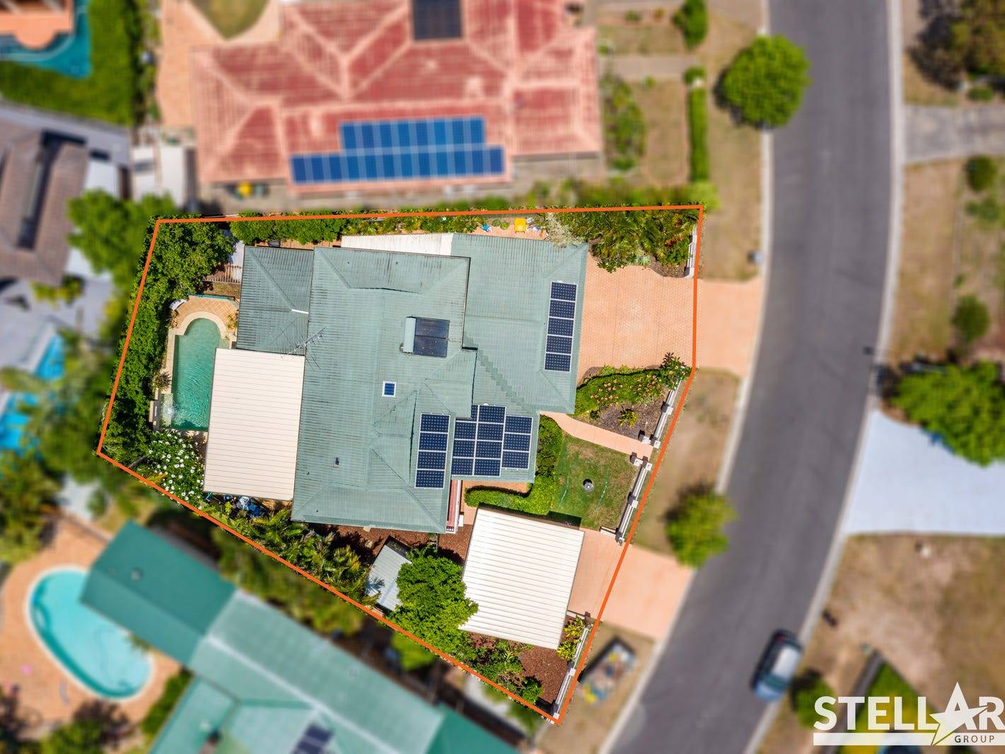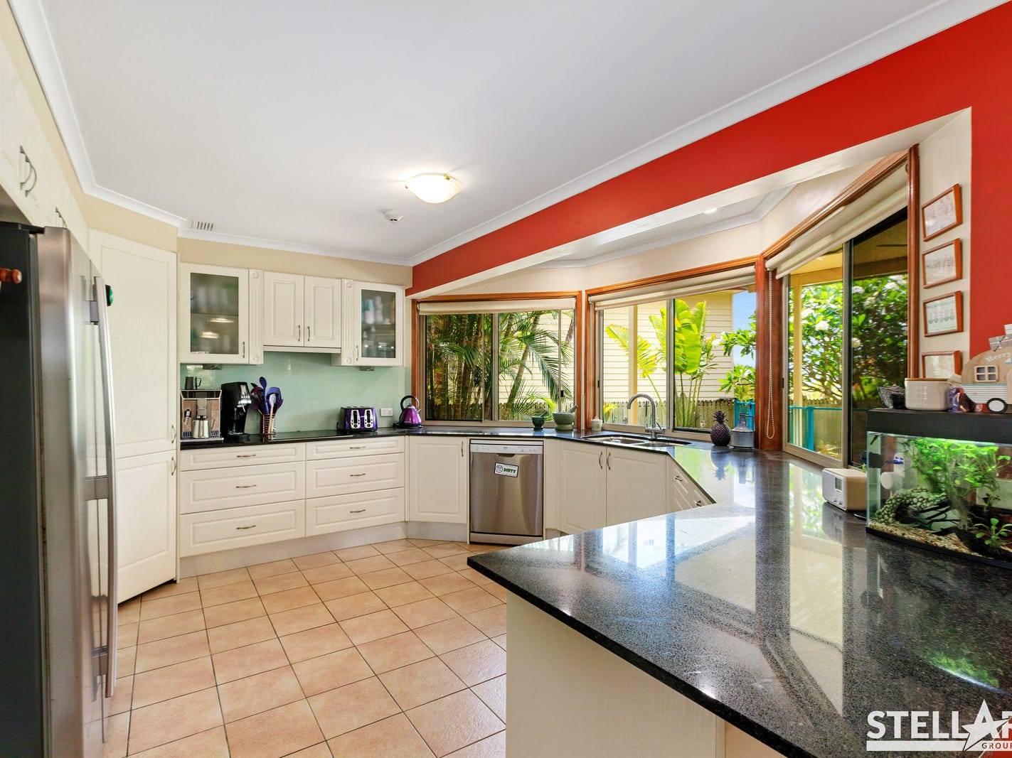 The kitchen overlooks the large outdoor alfresco entertaining area and pool with waterfall wall feature and a spa area which are ideally situated on the property shaded in the afternoon by the tropical landscaping. Also downstairs are the fifth bedroom and another two large living spaces including meals area and family room with storage cupboards, plantation shutters and air-conditioning. The internal laundry gives access to the third bathroom and side patio.