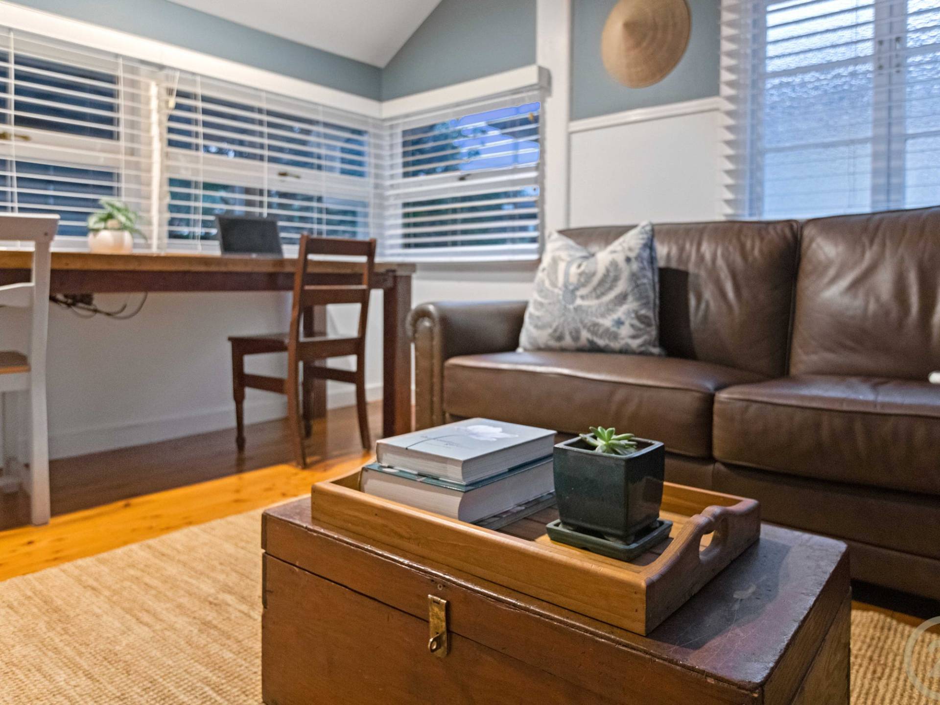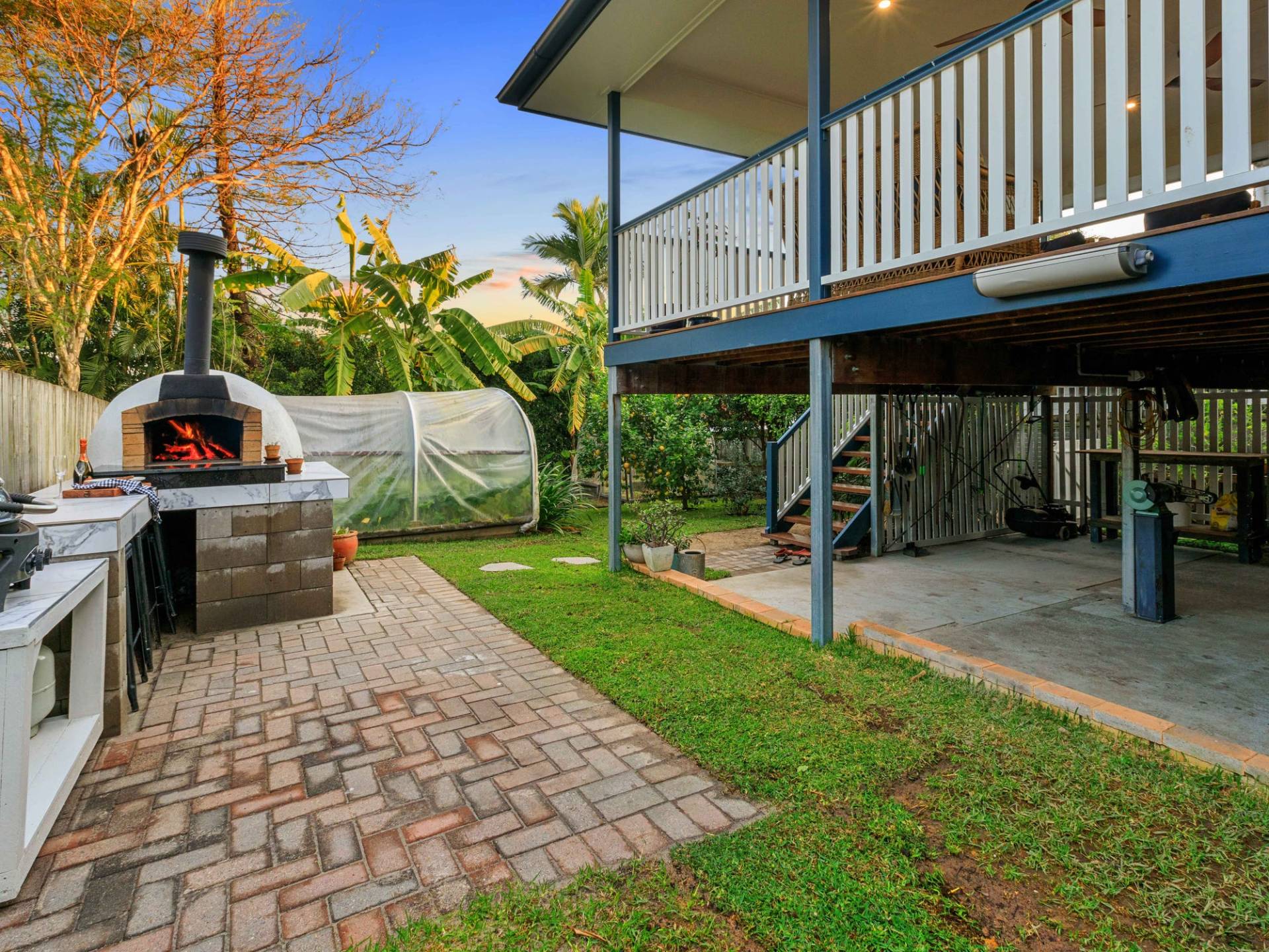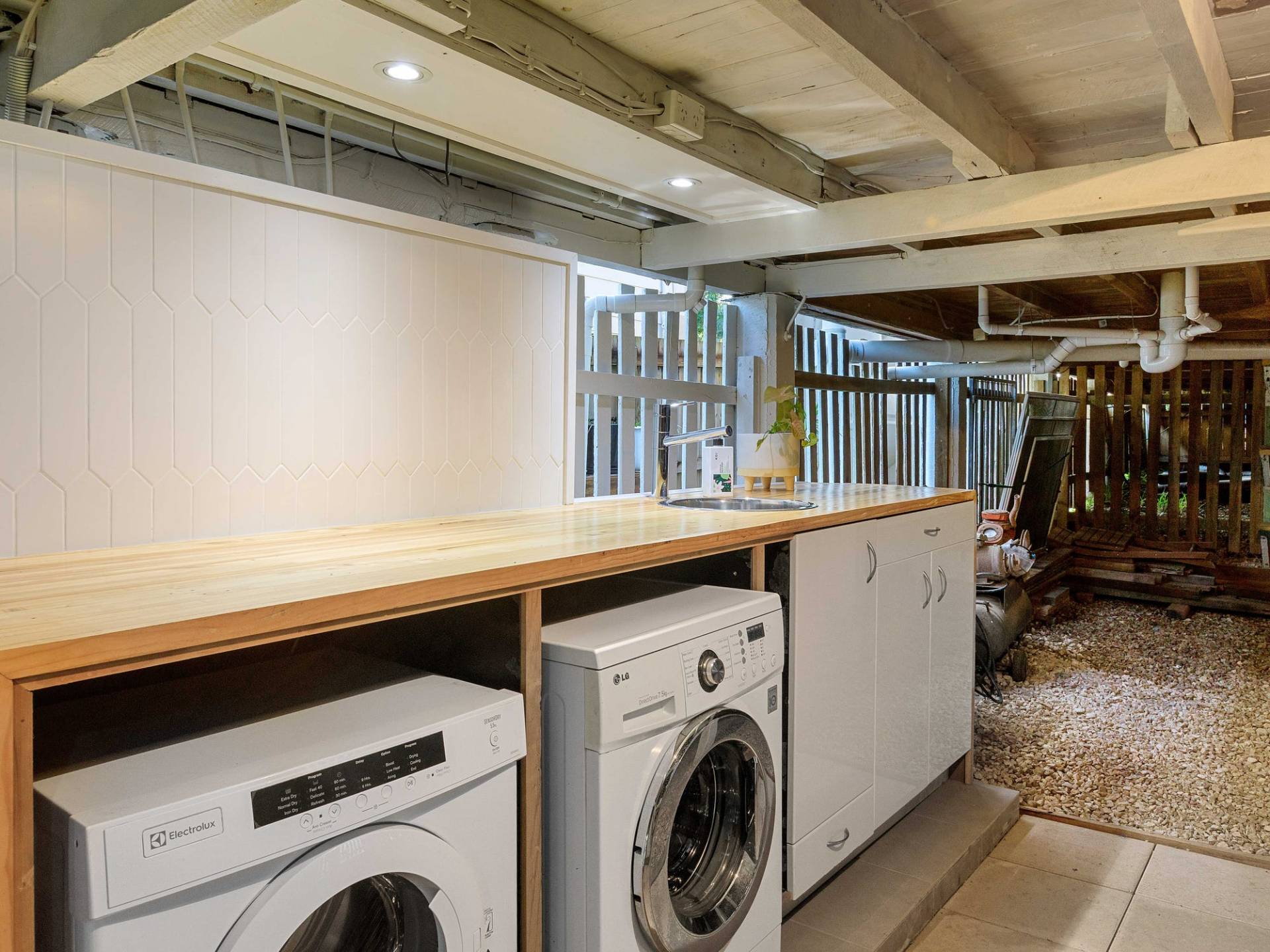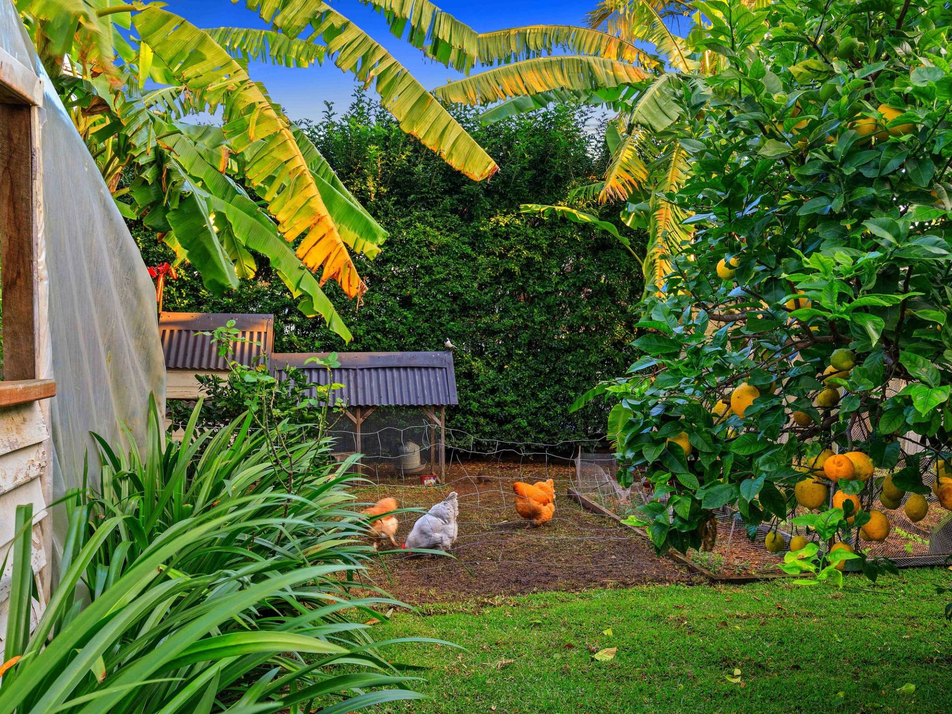 The lush green back garden includes: two large, raised vegetable gardens, orange, mandarin, lemon, feijoa, mulberry, blueberry, chilli, and lady finger banana trees, which provide an ample amount of food. The yard also features an outdoor shower, kitchen sink, and shelving for your plant collection. Plenty of grass will keep the little ones happy too.