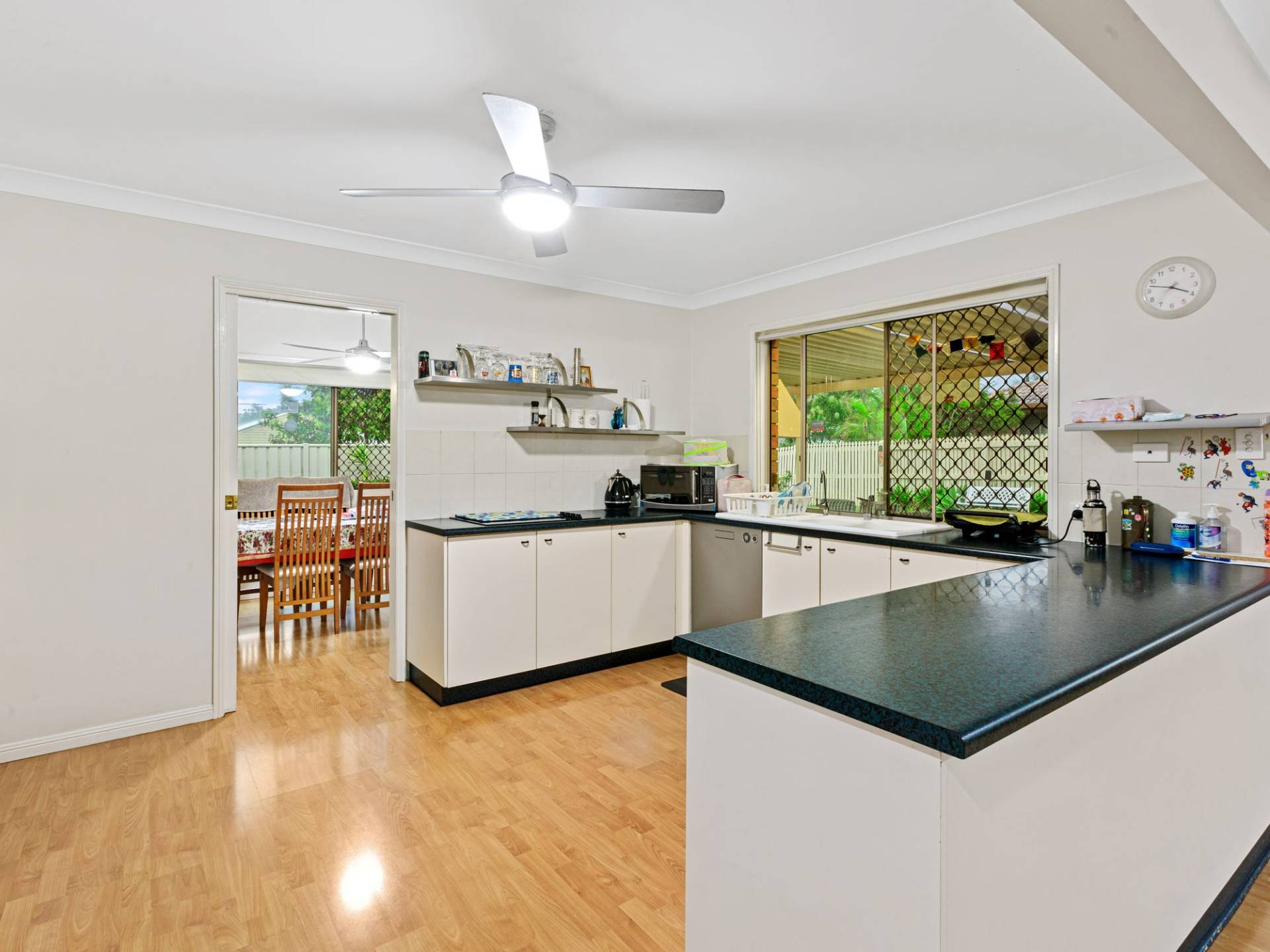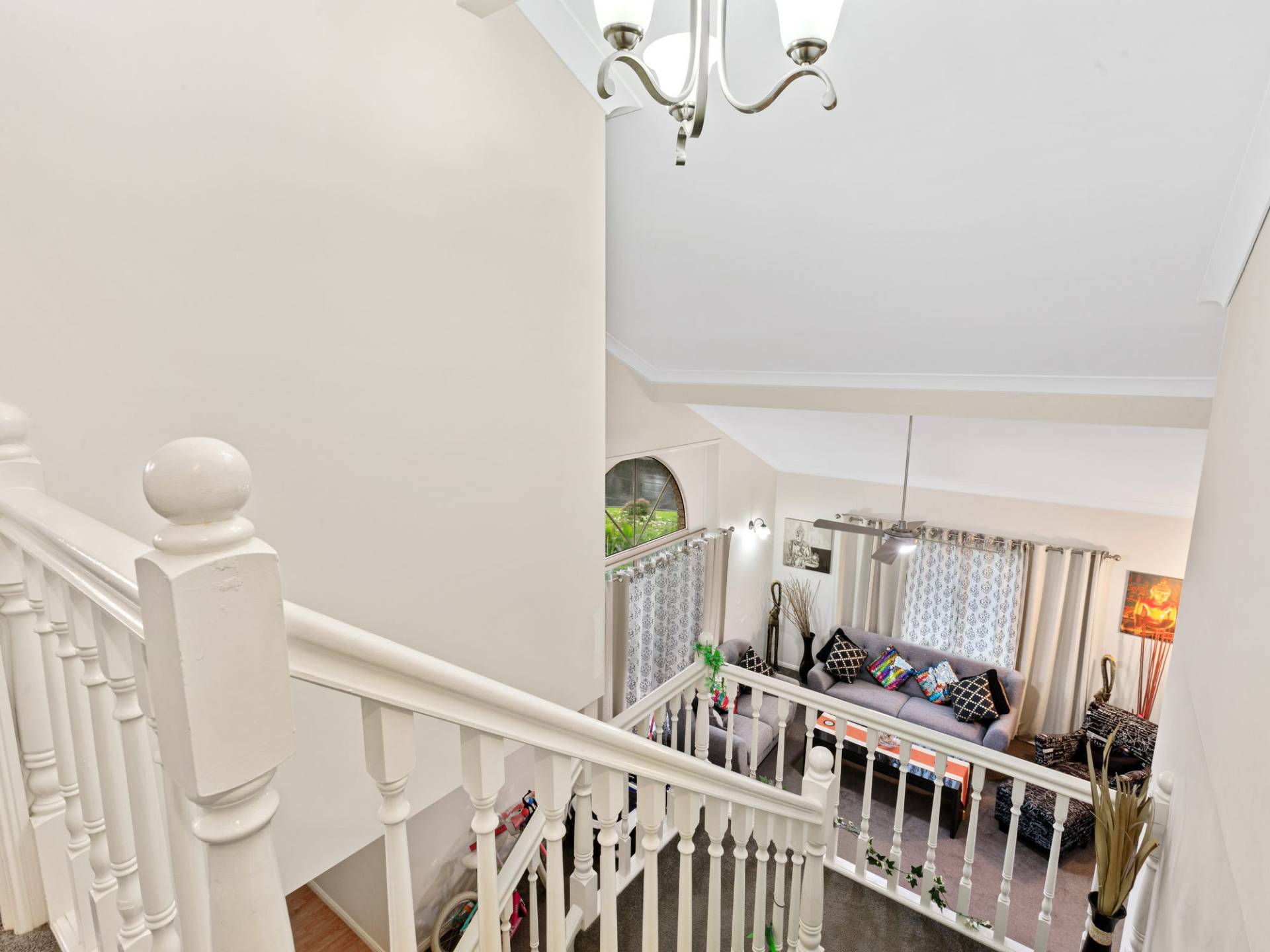 Continuing there is a formal dining room with access to the spacious kitchen which overlooks the outdoor entertaining area and the backyard. There is also an open-plan family room that opens onto the outdoor entertaining area. The fourth bedroom is downstairs with direct access to the two-way bathroom, which would make a great guest bedroom or office to work from home. Upstairs there are three spacious carpeted bedrooms, with built-ins, air-conditioning, and ceiling fans.