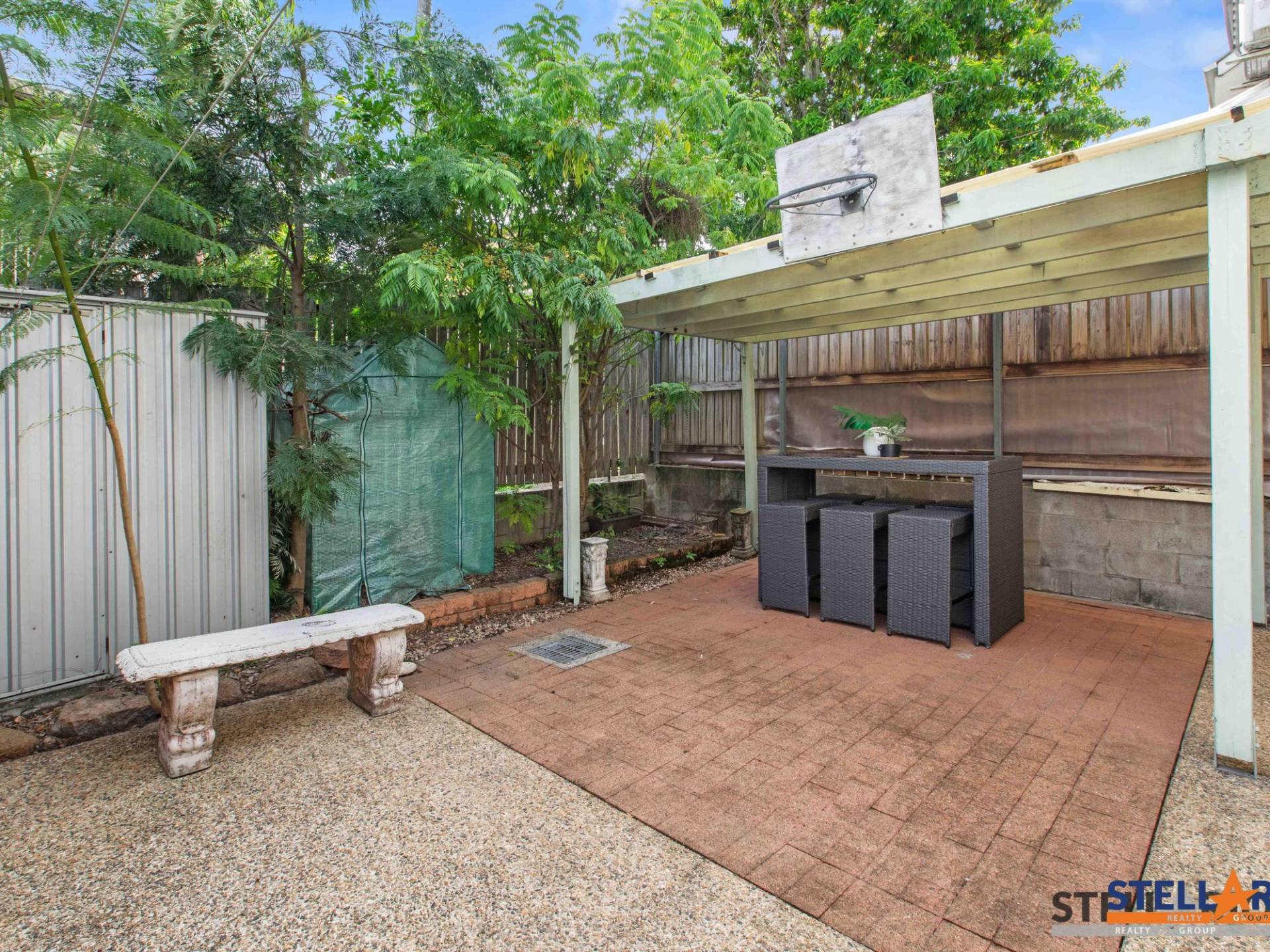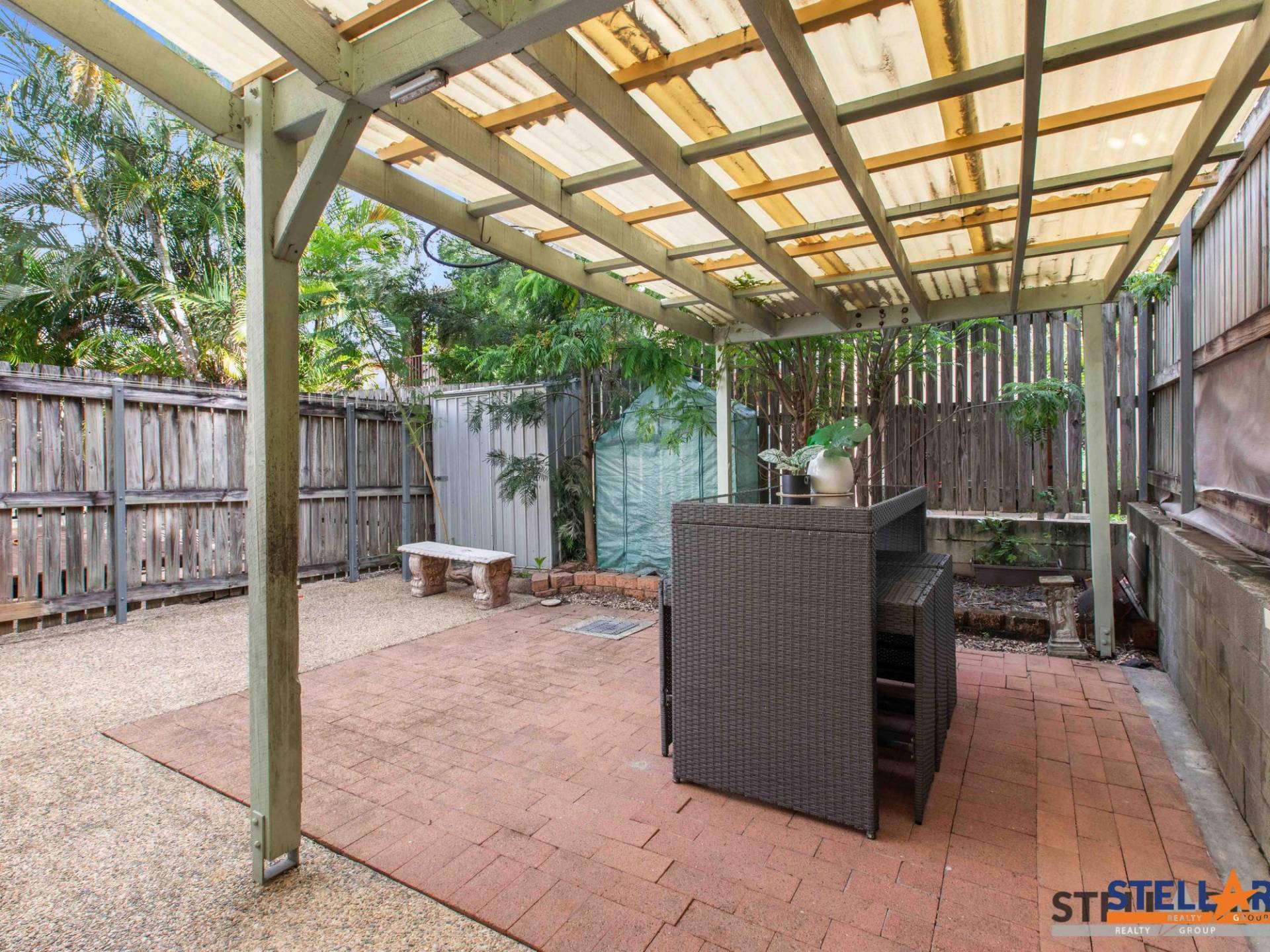 - Paved private courtyard with garden shed and covered patio