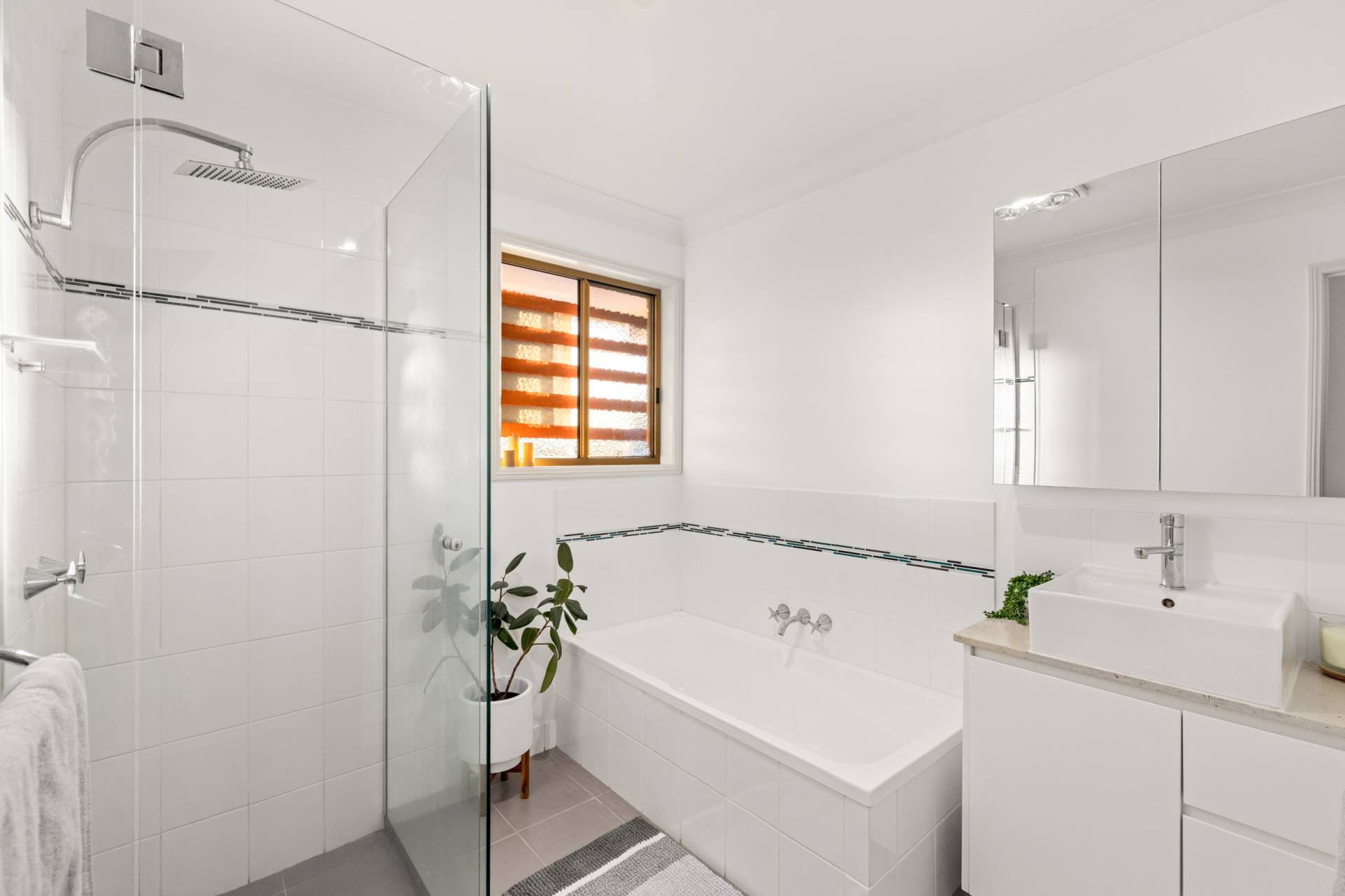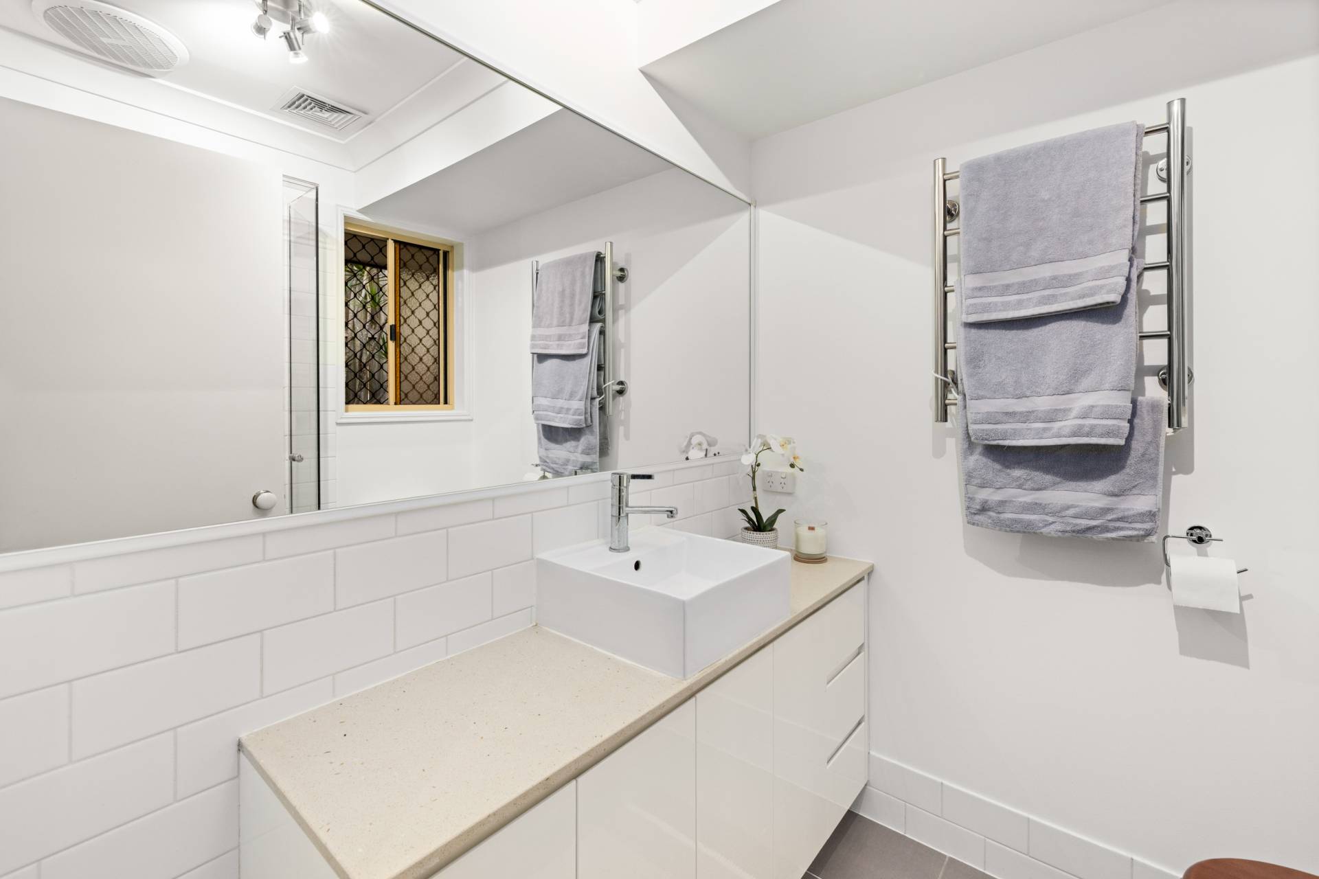 The master suite is a private retreat with a ‘his and her’ walk-through robe, an ensuite featuring a walk-in shower and sliding doors allowing access directly to the back deck. The main bathroom also includes a walk-in shower, bath and a generously sized vanity.