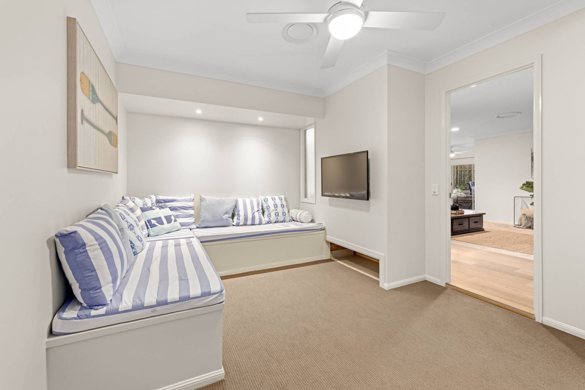 In addition to fully ducted air conditioning, all four bedrooms are spacious and beautifully adapted with built-in cupboards and ceiling fans. The kids are well catered for with two bedrooms attached to a large media room, including built-in seats with storage.