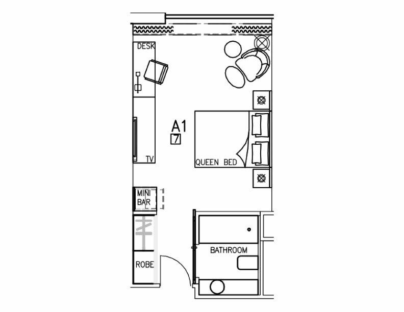 • Luxurious studio room with Queen bed, reading chair, TV, mini fridge and tea and coffee making facilities.