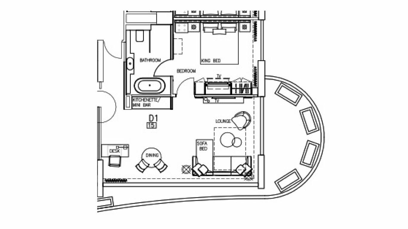 • Huge living areas with kitchenette/mini bar, sofa bed, dining area & working desk.
