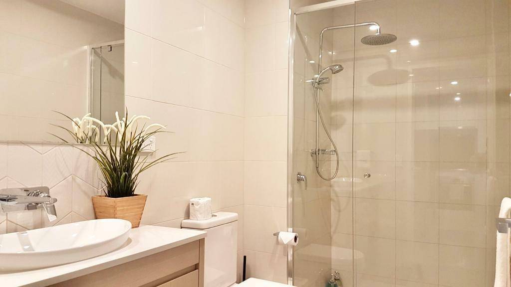 · Contemporary kitchen and bathroom adorned with pristine stone benchtops